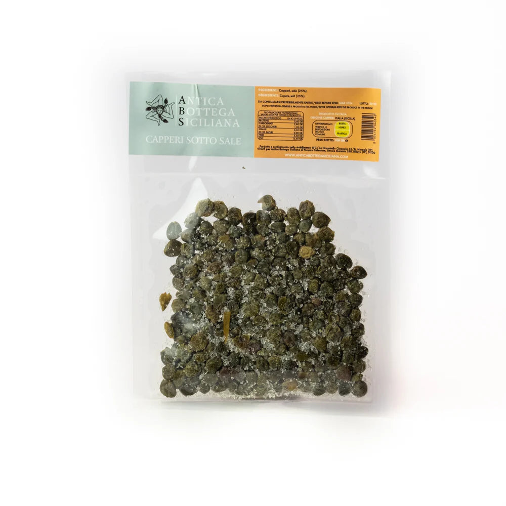 Capperi siciliani sotto sale confezionati in busta sottovuoto.