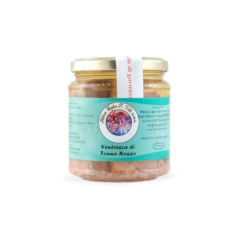 Ventresca di tonno rosso 300g. La Ventresca di Tonno Rosso è la parte più tenera e pregiata del Tonno, in quanto ne ricopre i fianchi e le cavità addominali. Si presenta al palato soffice e delicata. La Ventresca di Tonno Rosso è costituita da filetti pregiatissimi e molto delicati, conservati in olio d'oliva.